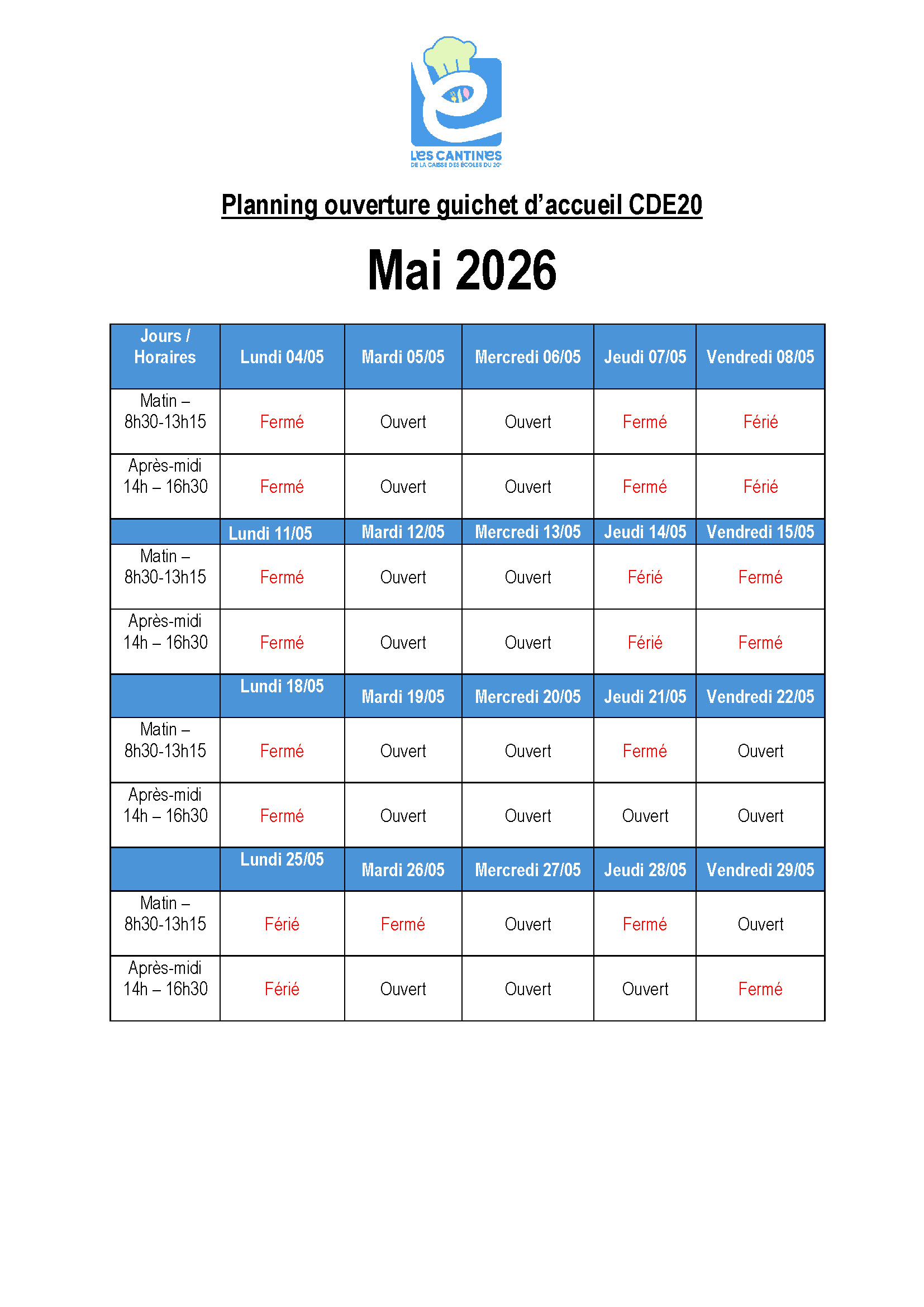 Retrouvez ci-dessous le planning détaillé des jours d’ouverture et de fermeture du service accueil.